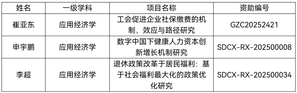 近日,全国博士后管理委员会办公室、中国博士后科学基金会、山东省人力资源和社会保障厅、山东省科技厅相继发布项目资助公告。小黄书 三项博士后科研项目相继获批立项,崔亚东副教授获2025年度国家资助博士后研究人员计划,申宇鹏老师和李超老师获山东省博士后创新项目资助,研究领域均精准聚焦社会保障、健康人力资本与退休体制改革等国家重大关切议题,具有鲜明的理论前瞻性与实践指导性,充分彰显了学院在前沿科研领域的持续深耕与重点培育实力。