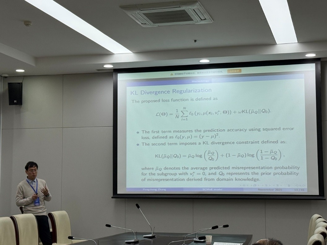 张鹏成报告了题为《High-dimensional claim severity modeling with misrepresentation adjustment via deep learning》的学术报告。该研究聚焦保险核保过程中因投保人虚报风险信息导致的定价偏误问题,创新性地构建了一种融合深度学习技术的建模框架,并通过对美国医疗支出调查数据的实证分析,验证了该方法的有效性。
