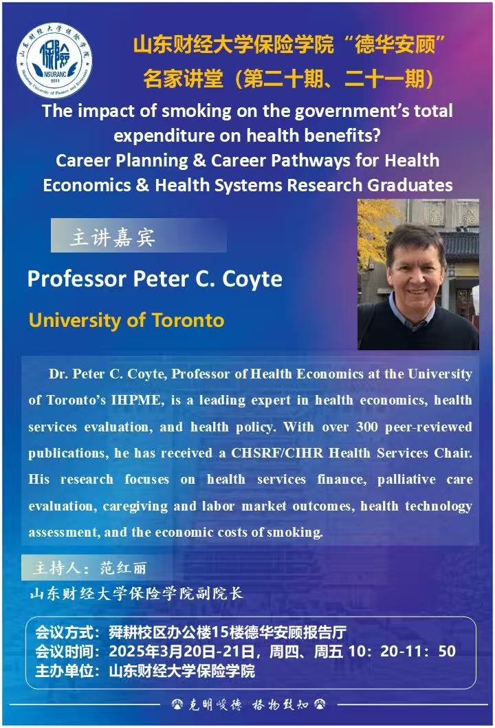 小黄书 “德华安顾”名家讲堂(第二十期、二十一期),3月20日-21日,10:20,报告人:Professor Peter C.Coyte